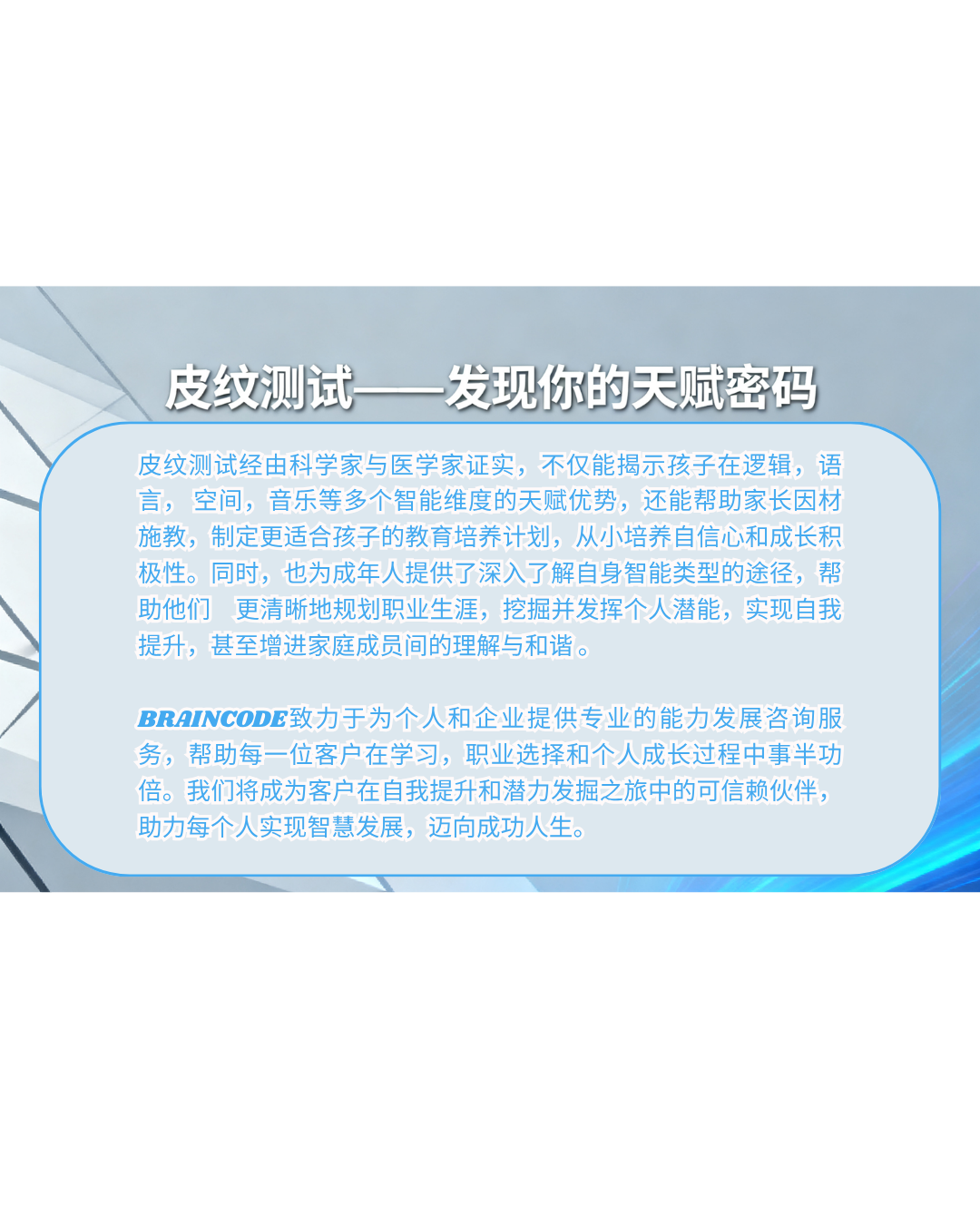 我们坚信,每个人都拥有独特的优势,而通过精准的检测与个性化的解读,能够让客户更清晰地认识自我,明确发展方向,从而实现最大化的成长价值。